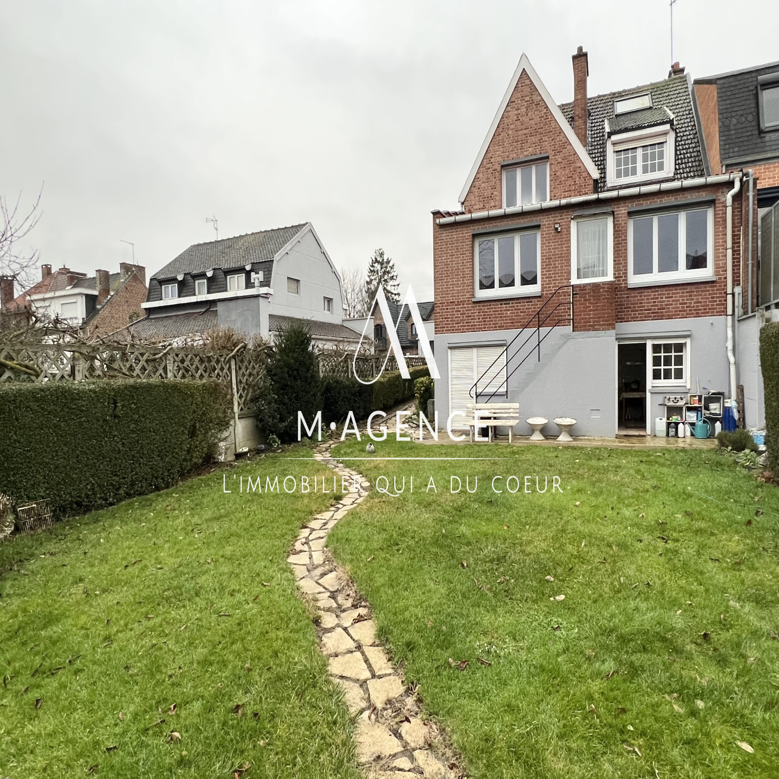 La maison est construite en retrait de rue sur une parcelle cadastrale de 548m², dans une rue calme et à sens unique. La parcelle sur l'avant de la maison comporte un portillon piéton donnant sur une allée pavée et bordée de verudure, ainsi qu'un portail électrique permettant d'accéder à une allée vers le garage. Un véhicule peut donc stationner devant le garage également. En façade, un passage sur le côté de la maison, clos par portillon également, permet d'accéder au jardin.