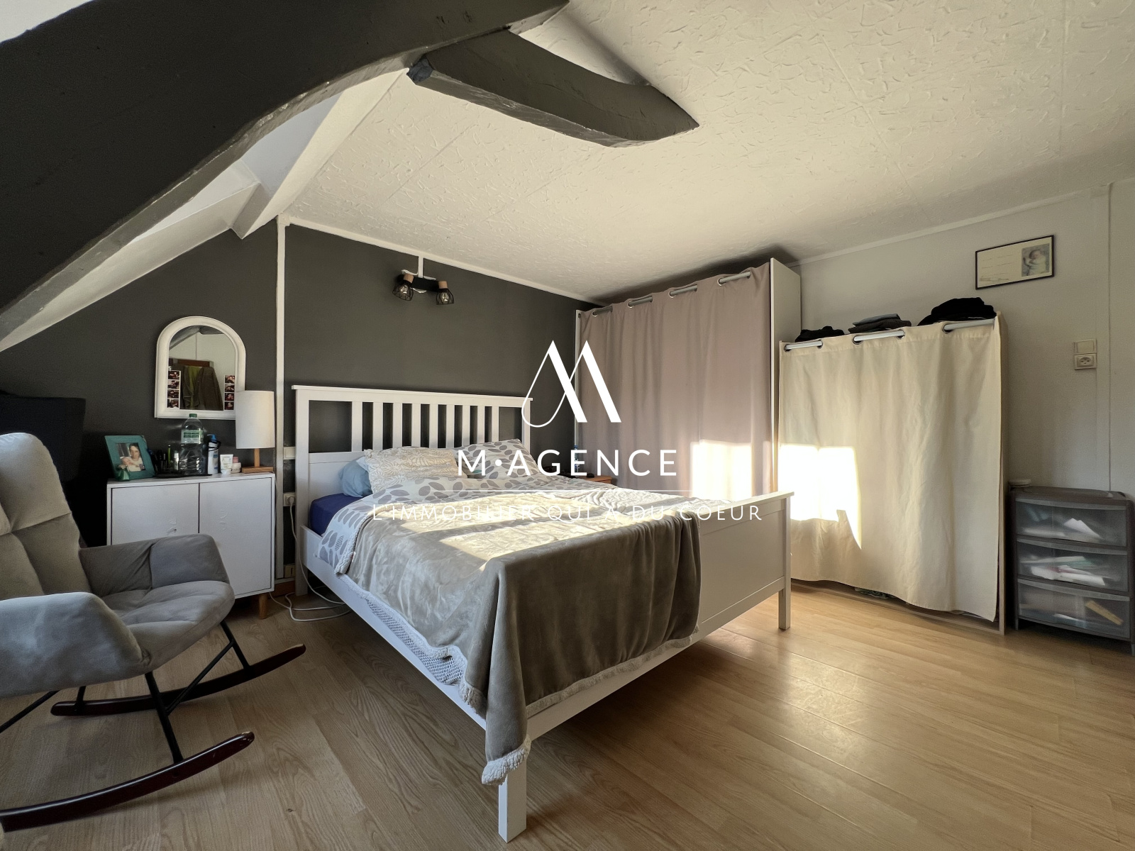 L'étage offre une première chambre spacieuse de 19m² en loi carrez, et une seconde chambre (coin nuit) de 7,37m² en loi carrez.