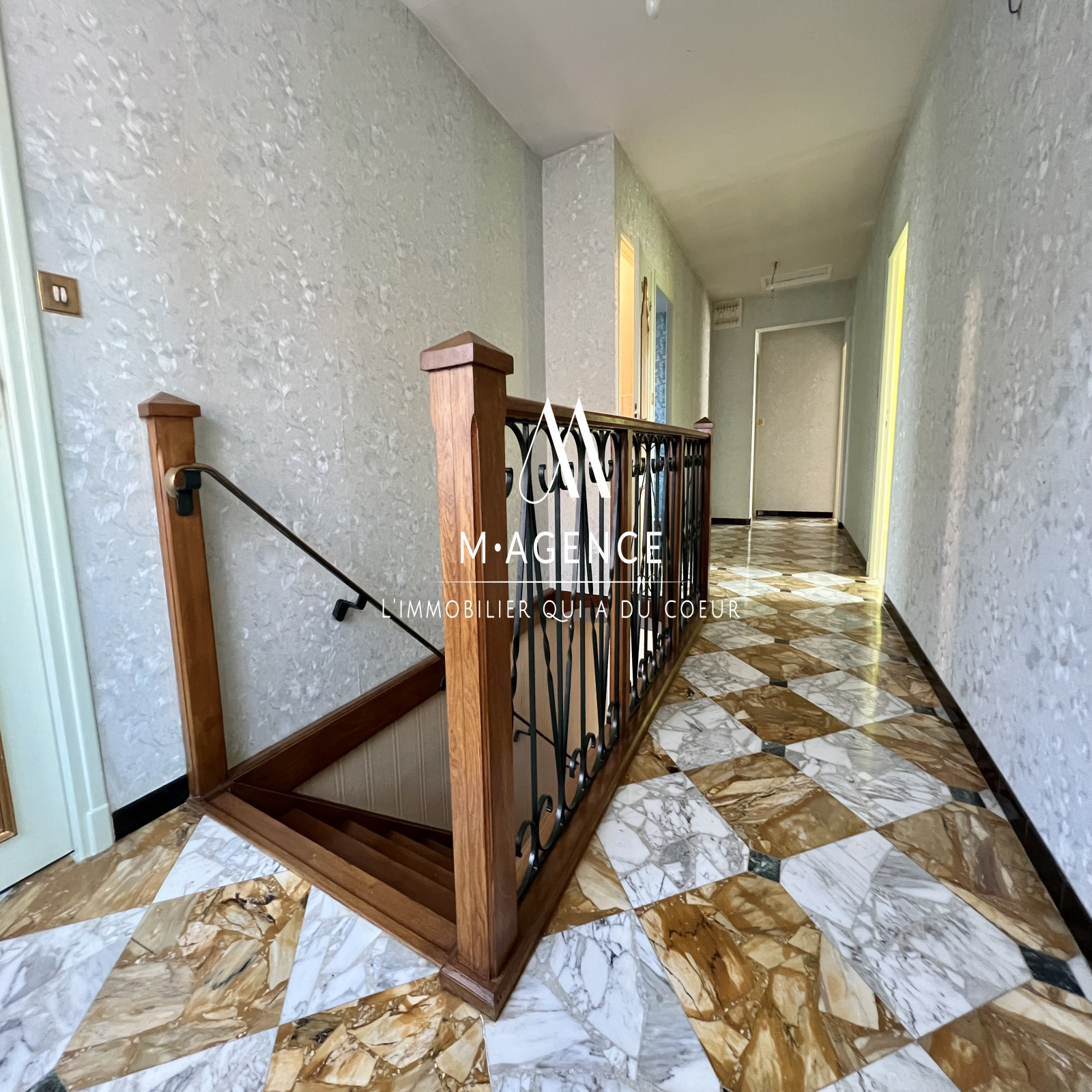 À l'étage, un large couloir avec marbre au sol, dessert :