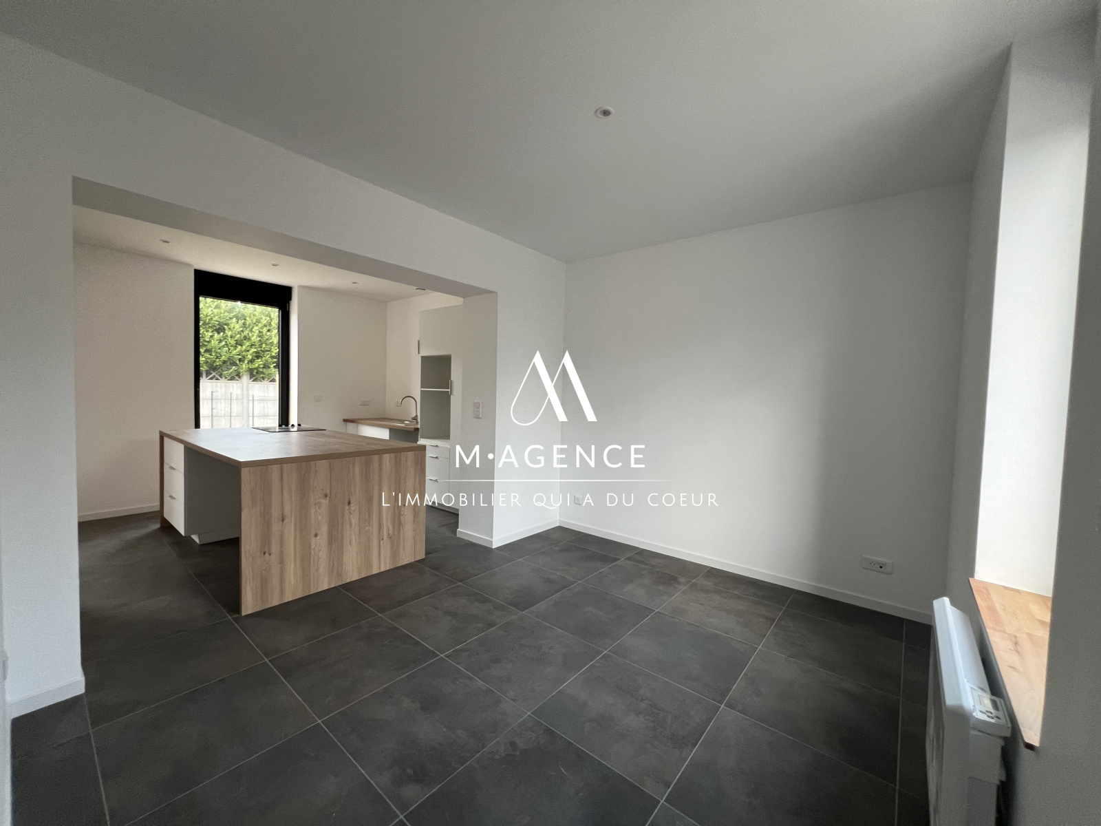 - une pièce ouverte salle-à-manger / cuisine de 22,5m² avec cuisine neuve, non équipée